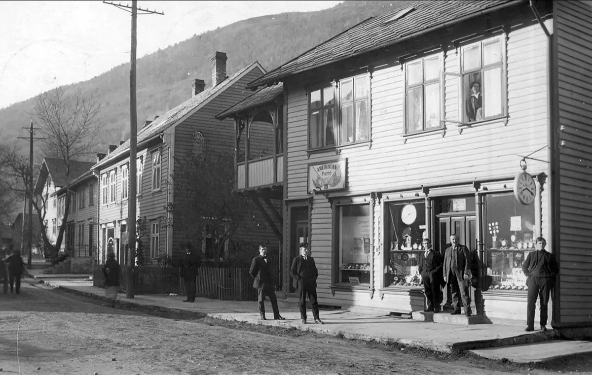 KJØPTE HUSET: I 1926 kjøpte Knut Severin Opheim dette huset på andre sida av gata for der dei starta opp butikken fire år før og etablerte verksemda her. Foto: Voss Folkemuseum