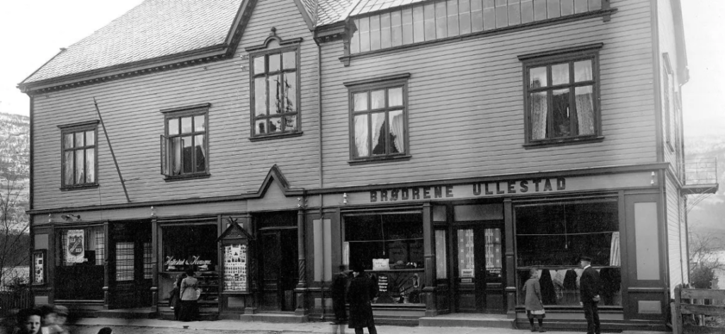 KJØPTE HUSET: I 1926 kjøpte Knut Severin Opheim dette huset på andre sida av gata for der dei starta opp butikken fire år før og etablerte verksemda her. Foto: Voss Folkemuseum